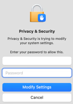 | Select "Unlock Network Settings" and a pop up will appear asking for your password to authorise this change |