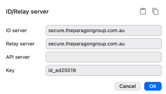 This procedure has set the access to the Paragon Group Server. Only systems connected to this server have the ability to connect to other systems on the network. A basic install of Rustdesk cannot connect to a machine setup for the Paragon Group network.